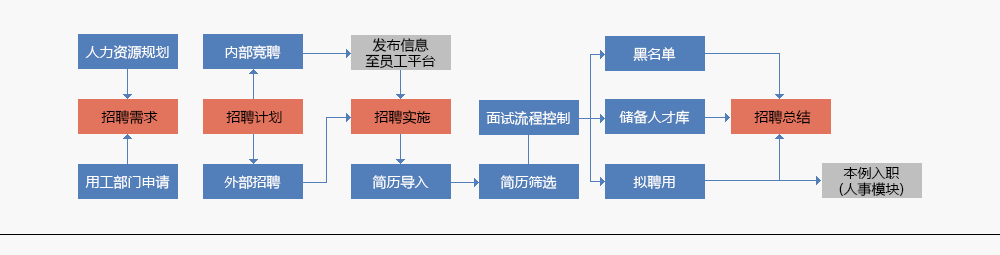 | 产品支持流程化、规范化的完整招聘业务流程,包括以用人部门提出用工需求或人事部门发起用工征集为起始,制定包含招聘活动、预算、覆盖地区以及招聘职位等详细信息的招聘计划,并依据计划开展面试相关工作,如针对职位设置面试流程、简历快速导入、多简历对比、面试官填写面试评估表等;待招聘计划结束后,可针对计划填写招聘总结以备统计查询。同时,招聘选拔模块可以配合能力素质、人事基础模块的应用,面试官既可以在面试评估中为候选人进行能力素质等级评定,又可以给出面试意见,而面试通过的候选人经系统可直接进入到员工入职流程。 |