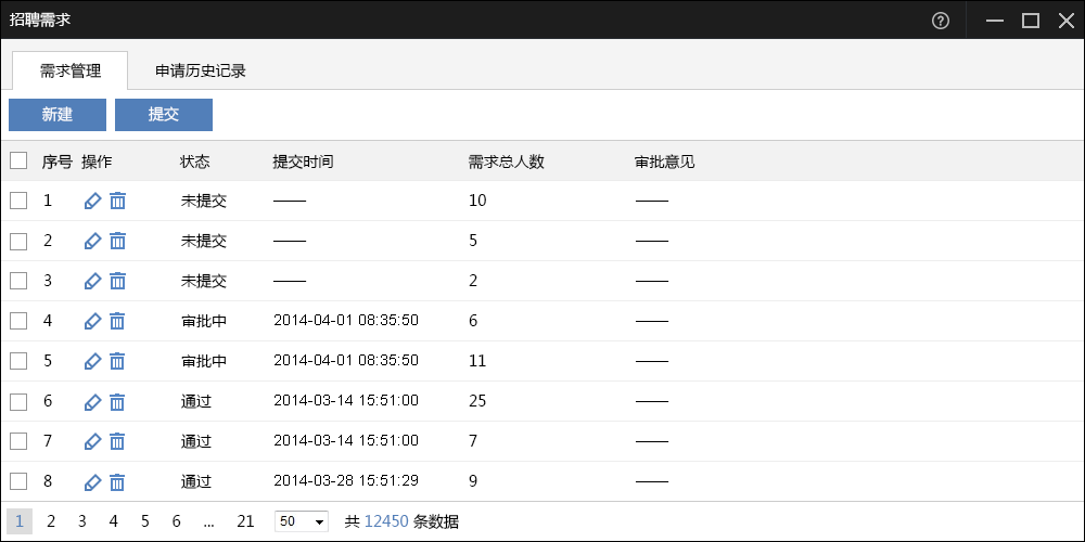 模块支持企业根据满足用人部门需求和企业人力规划管理招聘需求。用人部门可将补充职员、扩编等用人需求通过系统汇总到人力资源部,HR将依据实际数据对需求进行分析判断,实现用人部门与人资部门的无缝衔接。同时,HR也可根据企业职位规划与编制情况,制定相应招聘需求,以满足长期和短期的人力供需平衡。