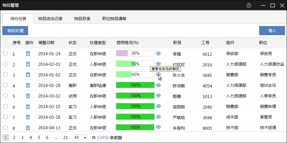 模块提供精细的物品管理功能,HR可通过物品管理菜单处理物品待办任务,并对物品的申领、交还进行完整记录。此外还设置有物品目录及职位物品清单,保证公司物品的高效利用。