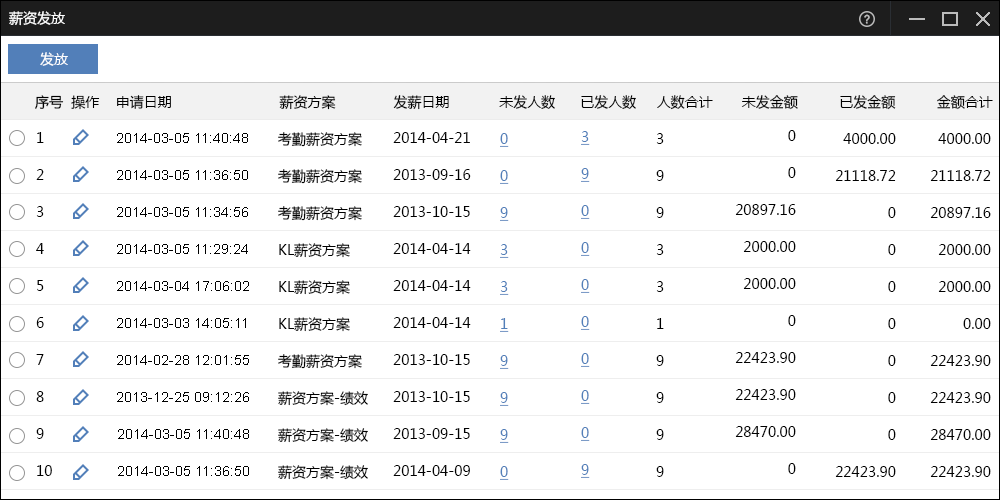 模块支持HR对薪酬发放业务链进行完整全面的管理。HR可通过薪资发放菜单处理薪资发放任务,支持工资条导出,并可根据银行要求,生成银行指定输出格式的文件并导出,实现企业与银行间工资发放业务的无缝衔接。并可对薪资发放结果生成历史记录,提供可靠、可查的信息数据。